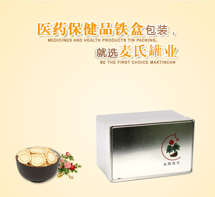 人參破壁飲片鐵盒-保健品鐵盒系列-鐵盒,鐵罐,鐵盒包裝 ,鐵盒廠家,印鐵制罐廠—麥?zhǔn)瞎迾I(yè)有限公司:尺寸: 154*100*90mm 材質(zhì):包裝方式:每個放在塑料袋里面,或者根據(jù)客戶的要求印刷:四色印刷或?qū)I∷ⅲ蛘吒鶕?jù)客戶的需求厚度:0.23mm。