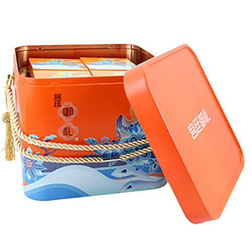 這款方形紅蓋手提蛋卷錦繡華禮盒鐵盒的尺寸為235*235*210mm,為了順應(yīng)多樣化的市場(chǎng)包裝需求,這款茶葉馬口鐵盒可做成心形、正方形、橢圓形、車形、書本形等異形造型。
