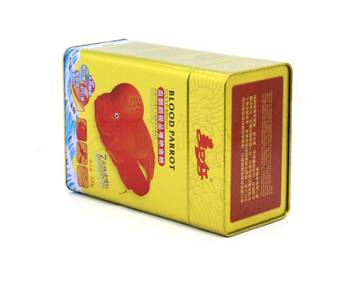 此款寵物食品包裝鐵盒為麥?zhǔn)瞎迾I(yè)為廣大客戶推出的血鸚鵡魚飼料鐵盒子,此款鐵盒的規(guī)格為140*90*205mm。鐵盒的印刷工藝為CMYK+1專,外過(guò)水性亮光油,內(nèi)過(guò)符合國(guó)家規(guī)定的金油,客戶可根據(jù)自身產(chǎn)品的需求選擇啞油、皺紋油、爆炸油等印刷工藝。