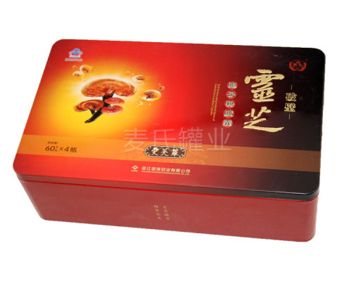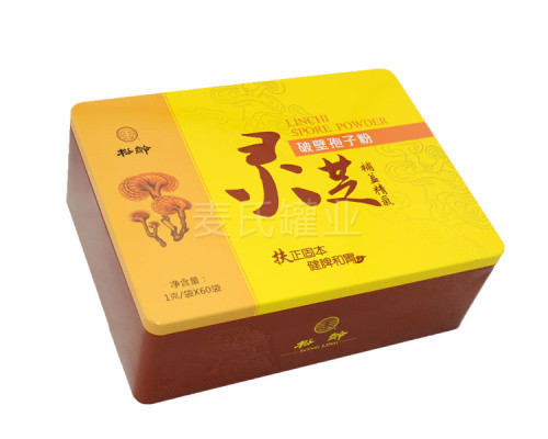 這款靈芝超細粉包裝鐵盒,其材質依然為0.23mm馬口鐵制成,可選擇制作成本低的馬口鐵制作,具體制作方式需根據(jù)您的產(chǎn)品特征與包裝需求所決定。鐵盒結構為雙層內塞蓋,底部為外卷線鑼底,盒身有扣骨,采用打磨器進行打磨光滑處理。在印刷方面,鐵盒為單面四色+專色印刷工藝,外過高亮效果的光油涂料處理,內部亦是。