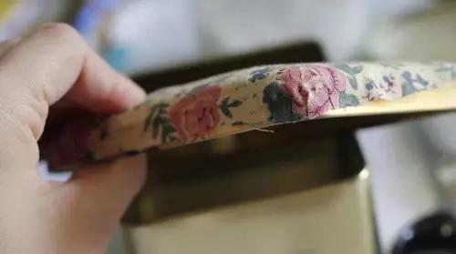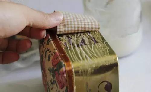4、表布拐角處剪牙口,鐵盒邊緣涂上白膠,仔細(xì)按壓。
