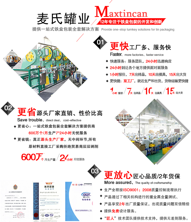 此款鹿角膠馬口鐵盒所采用的材質(zhì)、油墨、配件等產(chǎn)品均為綠色環(huán)保材料,,產(chǎn)品曾多次通過機(jī)構(gòu)認(rèn)證檢測(cè),其中包括:FDA、SGS、LFGB等,鐵盒從生產(chǎn)到出庫,全程無塵車間制作,QC全檢,保證每一款鐵盒都標(biāo)準(zhǔn)、安全。真正打造國內(nèi)鐵盒包裝品牌。