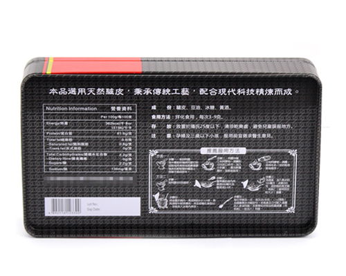 此款山東阿膠鐵皮盒子表面有雕刻工藝處理,雕刻(激凸)分為平雕與浮雕,浮雕工藝制作出來的鐵盒產(chǎn)品,圖案文字會(huì)以3D立體化的視覺方式展現(xiàn)出現(xiàn),對(duì)產(chǎn)品品牌宣傳起到了畫龍點(diǎn)睛的作用。我司還可制作出裱紙、貼鉆、鐳射等工藝效果,以能力滿足客戶多方面的制作需求。